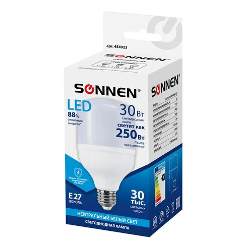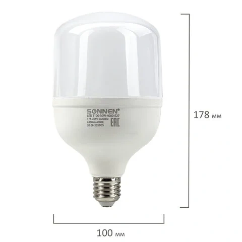 Оснащена цоколем типа Е27 и излучает нейтральный белый cвет. Отличается длительным сроком службы. Имеет цилиндрическую форму колбы и сделана из белого матового пластика. Мощность лампы составляет 30 Вт. Представленная модель дает световой поток 2400 Лм, цветовая температура равна 4000 K. Диаметр лампы составляет 100 мм. Высота - 178 мм.