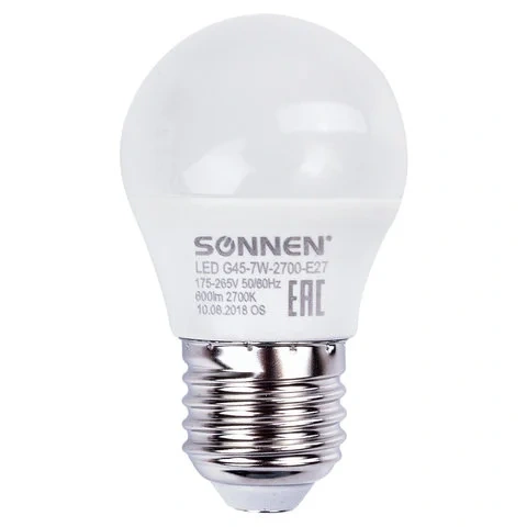 Лампа светодиодная Sonnen 7Вт, Е27, 2700К, теплый белый свет, шар