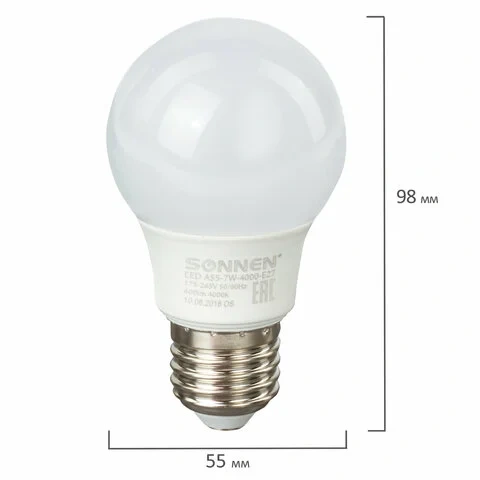 Оснащена цоколем типа Е27 и излучает холодный белый цвет. Отличается длительным сроком службы. Имеет грушевидную форму колбы и сделана из белого матового пластика. Мощность лампы составляет 7 Вт. Представленная модель дает световой поток 600 Лм нейтрального спектра, цветовая температура которого равна 4000 K. Диаметр лампы составляет 55 мм.