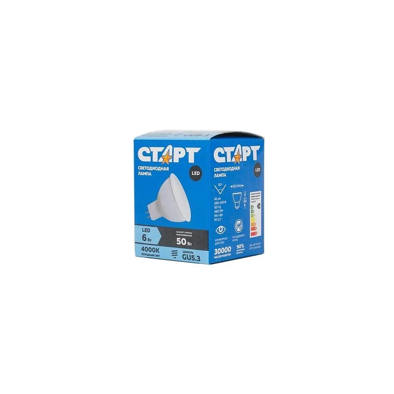 Светодиодная лампа Старт 6W GU5.3 4000k излучает нейтральный белый свет. Лампа создана для акцентного и общего освещения. Лампа благодаря своему качеству и невысокой стоимости, применяется повсеместно — как в доме, так и в офисных и индустриальных системах освещения. В дизайнерском решении применение холодного белого света визуально увеличивает пространство помещения. Светодиодная лампа Старт — это самый энергоэффективный источник света, при этом имеющий рекордный срок службы — до 30 000 часов. Напряжение: 230 В. Заменяет лампу накаливания 50 Вт.
