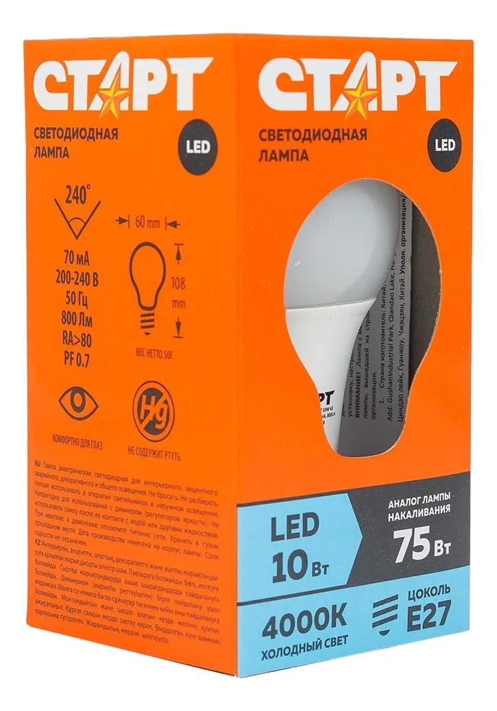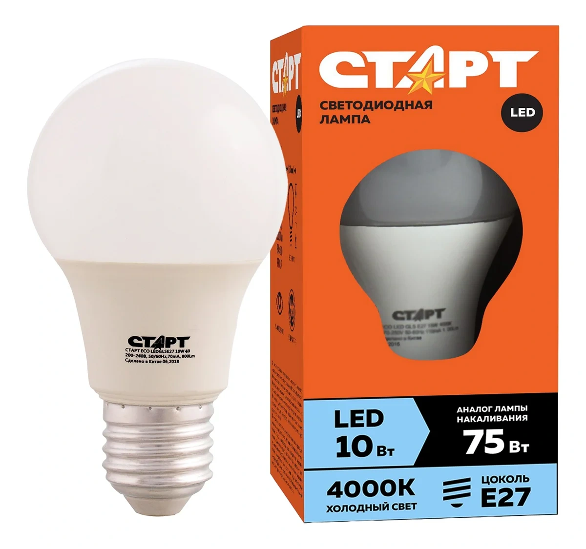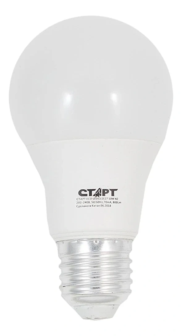 Светодиодная лампа Старт является оптимальной заменой ламп накаливания и галогеновых ламп. Обеспечивает равномерное освещение, не раздражающее глаза, имеет нечувствительность к перепадам напряжения и приносит существенную экономию по энергозатратам при постоянной эксплуатации. Среди преимуществ лампы матовый рассеиватель, дающий равномерный яркий и естественный свет в помещении, а также герметичное исполнение, позволяющее использовать лампу в уличных светильниках и комнатах с повышенной влажностью. Стандартный цоколь Е27 применим ко всем видам осветительных приборов.