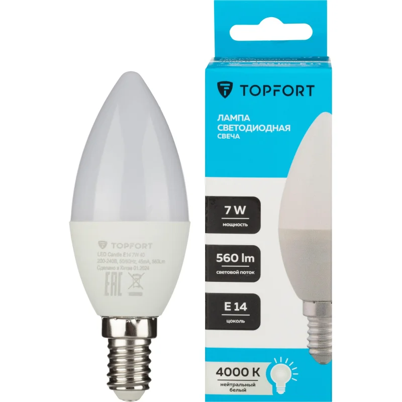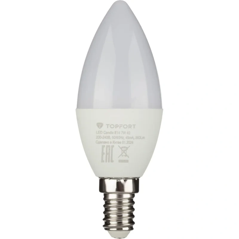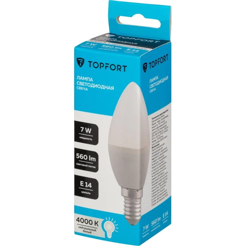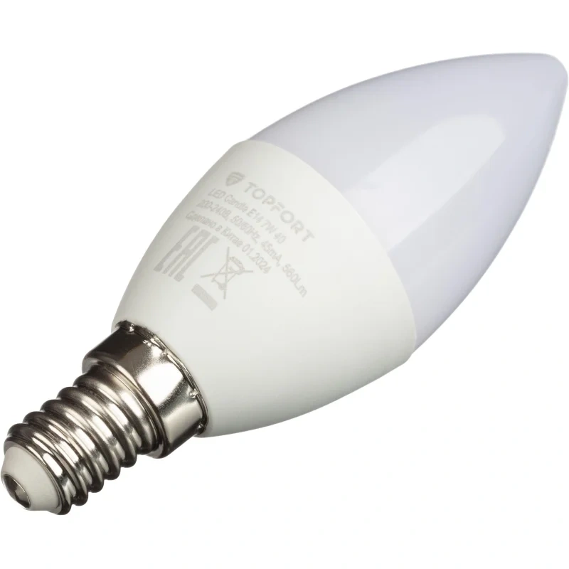 Лампа светодиодная TOPFORT 7 Вт E14 (C, 4000 K, 560 Лм, 220 В).Светодиодная лампа TOPFORT (матовая) формы свеча, с цоколем Е14, мощность 7 Ватт. Является аналогом лампы накаливания мощностью 60 Ватт. Матированное покрытие колбы позволяет рассеивать свет максимально приятно для восприятия глазом человека.Преимущества изделия:- Срок службы: 25 000 часов.- Диапазон рабочих температур от 25 до +50C.- Отличается низким энергопотреблением, что существенно снизит счёт а за оплату электроэнергии.- Создаёт равномерное естественное освещение.- Экологически и пожаробезопасна, не содержит ртути и других вредных химических веществ.- Не требует специальной утилизации.- Отсутствуют низкочастотные пульсации светового потока, негативно влияющие на зрение.Характеристики изделия:- Коэффициент цветопередачи Ra 80.- Световой поток: 560 Лм.- Цветовая температура: 4000 К.- Угол светового пучка 240.- Гарантийный срок 12 мес.Основные габариты (мм):- Длина: 100 мм (L).- Диаметр: 37 мм (D).Области применения:- Бытовое использование: потолочные, настенные, настольные светильники, люстры и бра.- Коммерческое освещение: мебельные салоны, салоны красоты, столовые, кафе, рестораны, фитнес-центры и т.д.Внешний вид и/или характеристики товара могут быть изменены производителем в соответствии с производственным процессом.