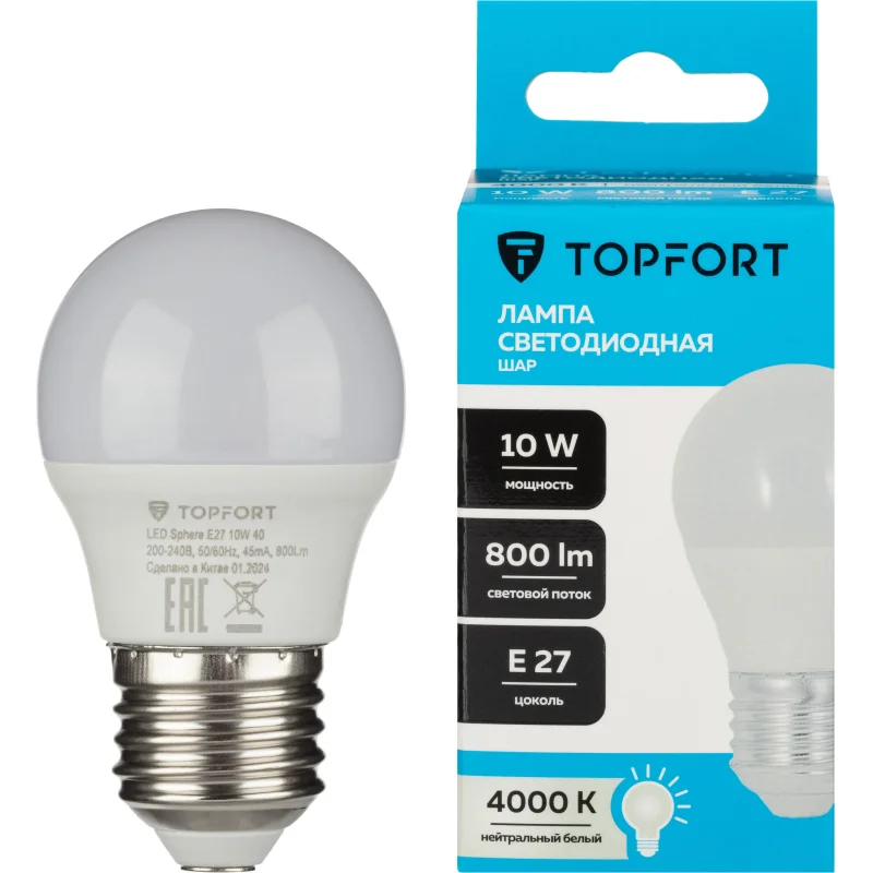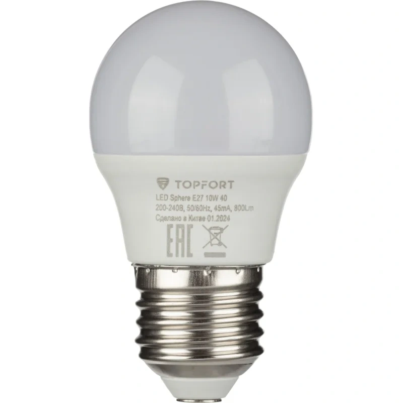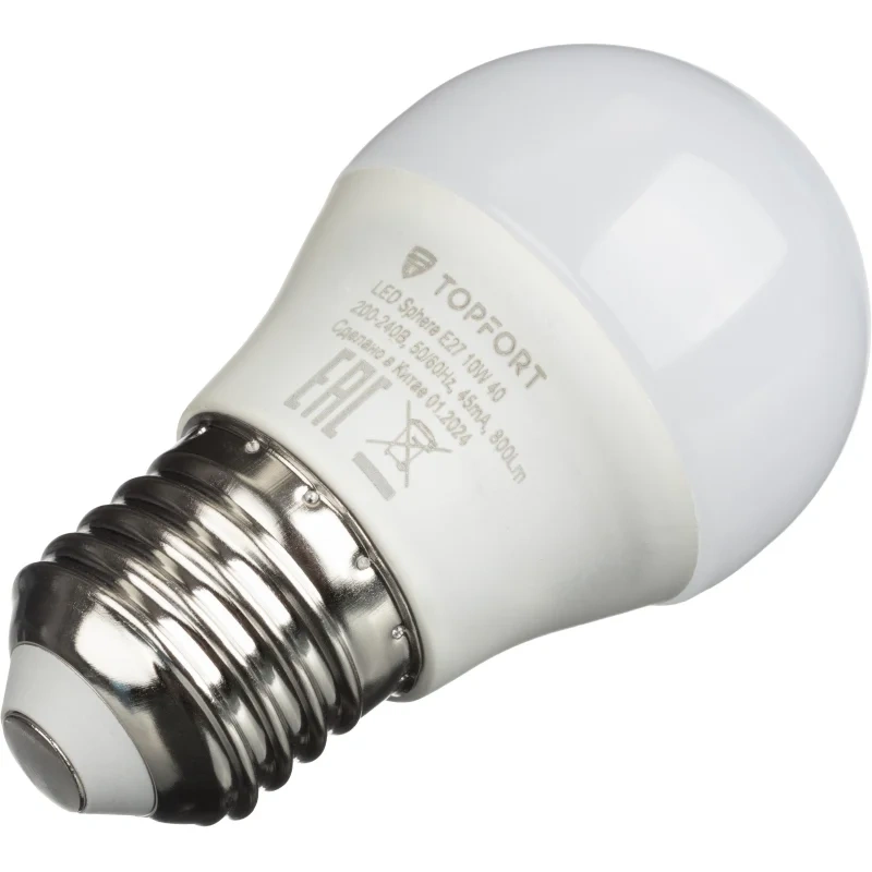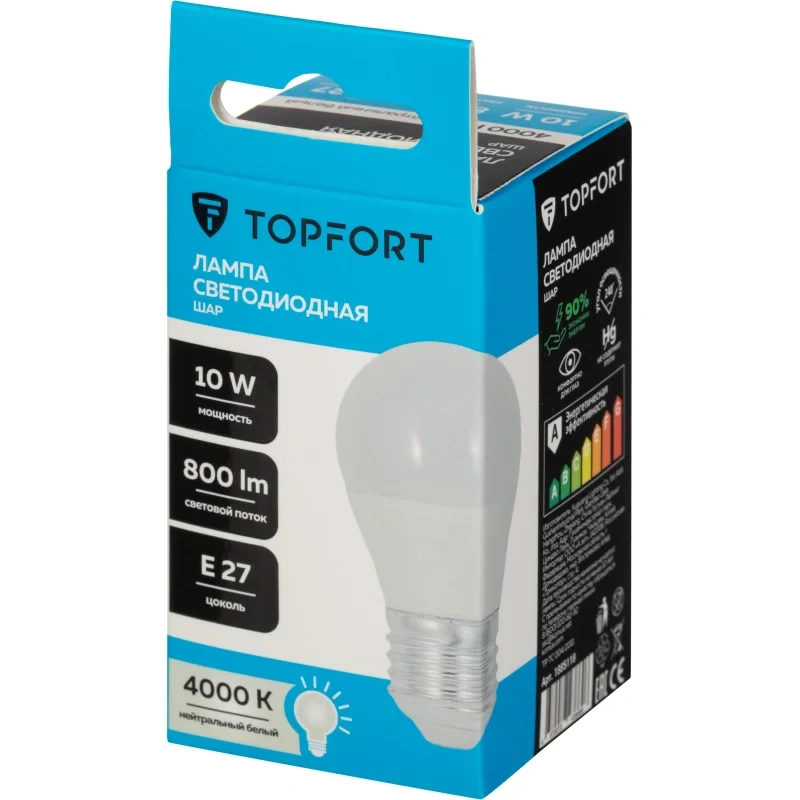 Лампа светодиодная TOPFORT 10 Вт E27 (G, 4000 K, 800 Лм, 220 В).Светодиодная лампа TOPFORT (матовая) формы шар, с цоколем Е27, мощность: 10 Ватт. Является аналогом лампы накаливания мощностью 75 Ватт. Матированное покрытие колбы позволяет рассеивать свет максимально приятно для восприятия глазом человека.Преимущества изделия:- Срок службы: 25 000 часов.- Диапазон рабочих температур от 25 до +50C.- Отличается низким энергопотреблением, что существенно снизит счёт а за оплату электроэнергии.- Создаёт равномерное естественное освещение.- Экологически и пожаробезопасна, не содержит ртути и других вредных химических веществ.- Не требует специальной утилизации.- Отсутствуют низкочастотные пульсации светового потока, негативно влияющие на зрение.Характеристики изделия:- Коэффициент цветопередачи Ra 80.- Световой поток: 800 Лм.- Цветовая температура: 4000 К.- Угол светового пучка 240.- Гарантийный срок 12 мес.Основные габариты (мм):- Длина: 89 мм (L).- Диаметр: 47 мм (D).Области применения:- Бытовое использование: потолочные, настенные, настольные светильники, люстры и бра.- Коммерческое освещение: мебельные салоны, салоны красоты, столовые, кафе, рестораны, фитнес-центры и т.д.Внешний вид и/или характеристики товара могут быть изменены производителем в соответствии с производственным процессом.