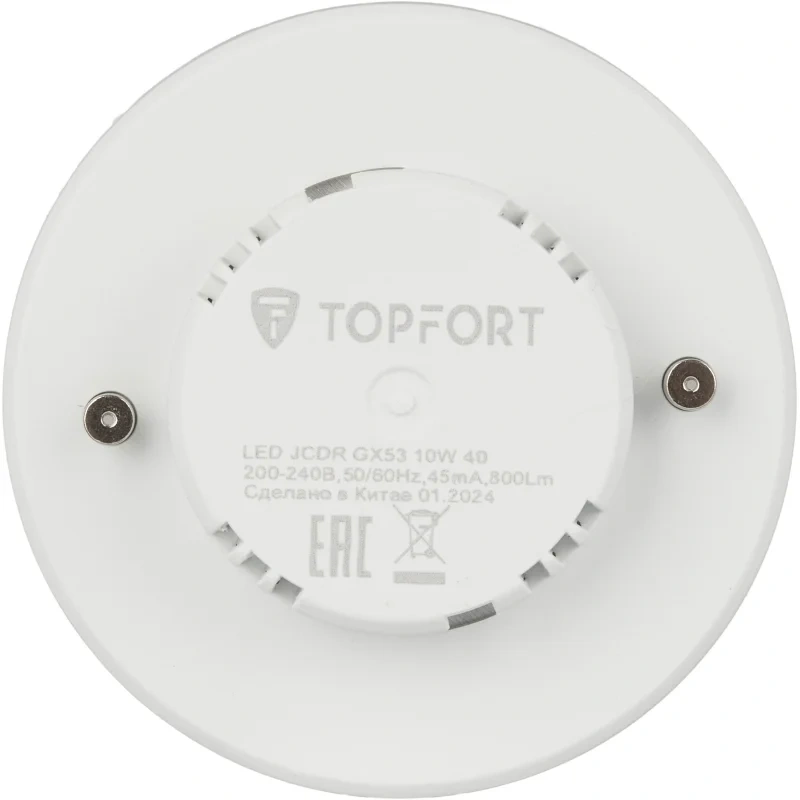 Лампа светодиодная TOPFORT 10 Вт GX53 (GX, 4000 K, 800 Лм, 220 В).Светодиодная лампа TOPFORT формы таблетки, с цоколем GX53, мощность: 10 Ватт. Является аналогом лампы накаливания мощностью 100 Ватт. Матированное покрытие колбы позволяет рассеивать свет максимально приятно для восприятия глазом человека.Преимущества изделия:- Срок службы: 30 000 часов.- Диапазон рабочих температур от 25 до +50C.- Отличается низким энергопотреблением, что существенно снизит счёт а за оплату электроэнергии.- Создаёт равномерное естественное освещение.- Экологически и пожаробезопасна, не содержит ртути и других вредных химических веществ.- Не требует специальной утилизации.- Отсутствуют низкочастотные пульсации светового потока, негативно влияющие на зрение.Характеристики изделия:- Коэффициент цветопередачи Ra 80.- Световой поток: 800 Лм.- Цветовая температура: 4000 К.- Угол светового пучка 240.- Гарантийный срок 12 мес.Основные габариты (мм):- Длина: 74 мм (L).- Диаметр: 25 мм (D).Области применения:- Лучшее решение для натяжных, подвесных и реечных потолков.- Помещения с повышенной концентрацией внимания сотрудников: диспетчерские центры, лаборатории, конференц-залы, библиотеки, офисные помещения.Внешний вид и/или характеристики товара могут быть изменены производителем в соответствии с производственным процессом.