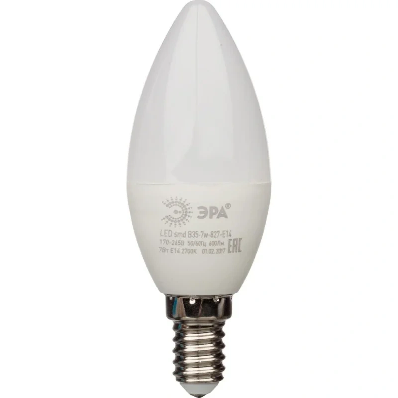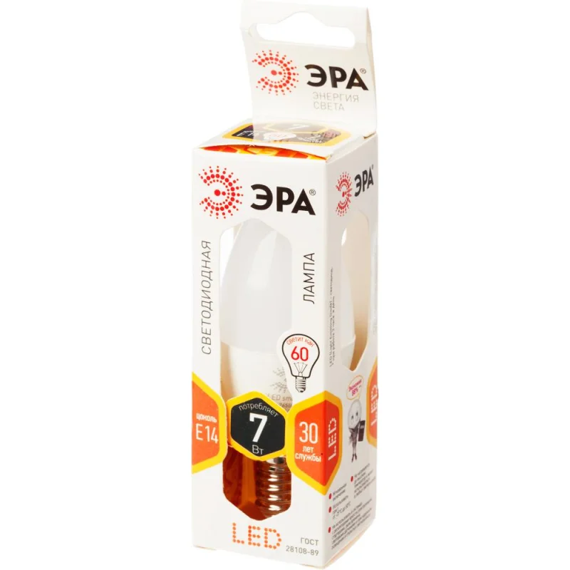 Лампа светодиодная Эра 7W E14 2700k тепл.бел.свеча LED B35-7W-827-E14