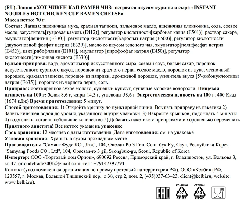 Легендарная и невероятно острая лапша из Южной Корей со вкусом курицы и 4 сыра. Очень сырный вкус, но в то же время очень острый, открывает новые вкусовые сочетания. Рекомендуем готовить именно так, как написано на упаковке, только так можно насладиться полным вкусом этого продукта.