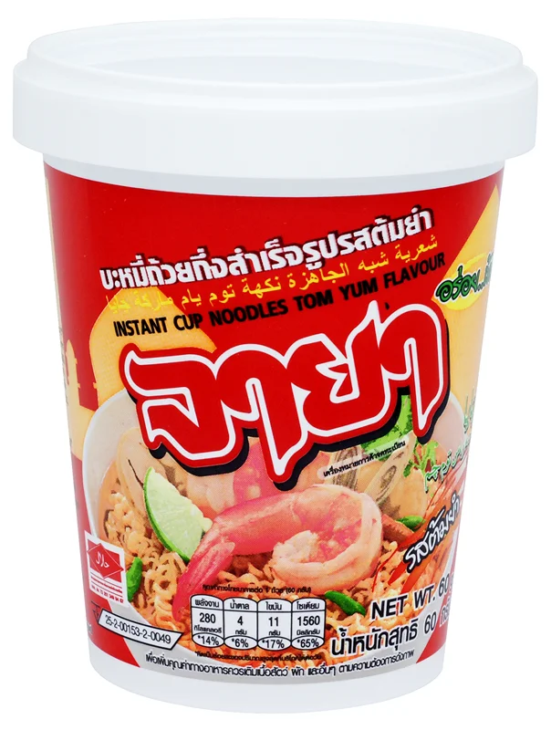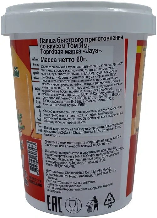 Лапша быстрого приготовления Jaya Том Ям, 60г - аутентичный вкус южной части Таиланда. Насыщенный пряный вкус лапше быстрого приготовления Jaya придают натуральные тайские травы и специи. Позволит быстро приготовить сытное и питательное блюдо. Такой продукт особенно понравится любителям паназиатской кухни и выручит в случае нехватки времени. Лапша может использоваться в качестве обеда или ужина как дома, так и на работе, в походах, во время поездок.