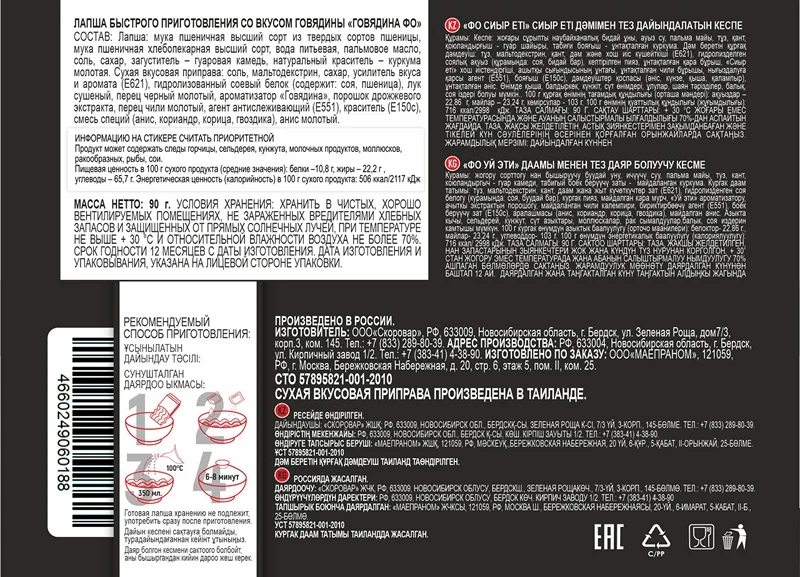 Рисовая лапша со вкусом говядины готовится в городе Бангкоке из рисовой муки с добавлением национальных тайских приправ и пряностей, благодаря которым и приобретает свой насыщенный вкус.