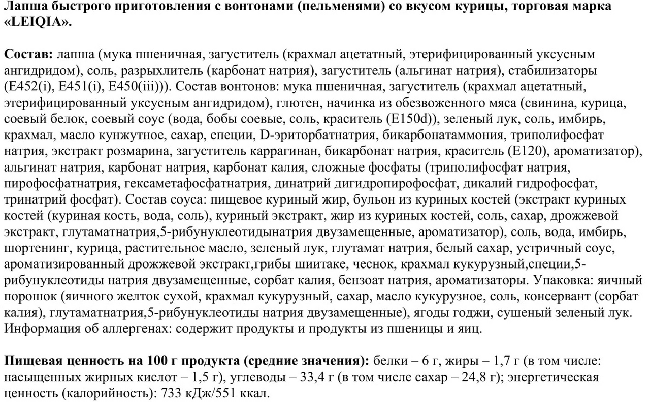 | Вкус | курица; вонтоны |