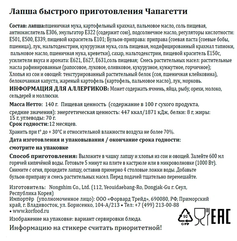 Чапагетти – бестселлер Nongshim. Острый и пряный рамен с восхитительным соусом из черных бобов – квинтэссенция азиатской кухни. Соевые бобы – главный источник растительного белка, а также витаминов А и Е, минералов и важных микроэлементов. Интересный темный цвет бульона – дополнительный бонус, а его аромат и необычный вкус – результат тщательно подобранных ингредиентов и букета специй. Чапагетти станет отличным гарниром к мясу и птице.