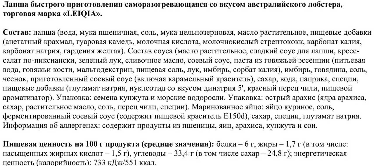 Лапша: пшеничная мука, растительное масло, загуститель крахмал ацетилированный, соль, клейковина, приправы смешанные, сахар, экстракт дрожжей, растительный протеин, лук, порошок соевого соуса, сушеный лук.