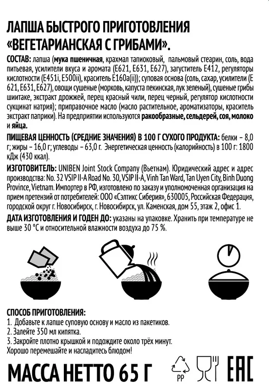 Эта лапша быстрого приготовления сочетает в себе насыщенные ароматы грибов шиитаке и простоту приготовления, позволяя вам насладиться полноценным блюдом всего за несколько минут. Лапша Reena идеально подходит для тех, кто ищет здоровую альтернативу традиционным быстрым блюдам. Благодаря легкости и быстроте приготовления, вы сможете радовать себя качественными вкусами даже в самые загруженные дни. Не упустите возможность порадовать себя и близких этой вкусной лапшой, которая станет отличным дополнением к вашему рациону. Прекрасно сочетается с различными соусами, овощами или белками, что позволяет создавать множество кулинарных вариаций. Отличный выбор для быстрого и вкусного перекуса. Упаковка содержит шесть порций по 65г, что делает её идеальной не только для одиночного обеда, но и для угощения друзей или семейного ужина. Эта лапша быстрого приготовления сочетает в себе насыщенные ароматы грибов и простоту приготовления, позволяя вам насладиться полноценным блюдом всего за несколько минут. Лапша идеально подходит для любителей вегетарианской кухни, а также для тех, кто ищет здоровую альтернативу традиционным быстрым блюдам. Благодаря легкости и быстроте приготовления, вы сможете радовать себя качественными вкусами даже в самые загруженные дни. Не упустите возможность порадовать себя и близких этой вкусной лапшой, которая станет отличным дополнением к вашему рациону.