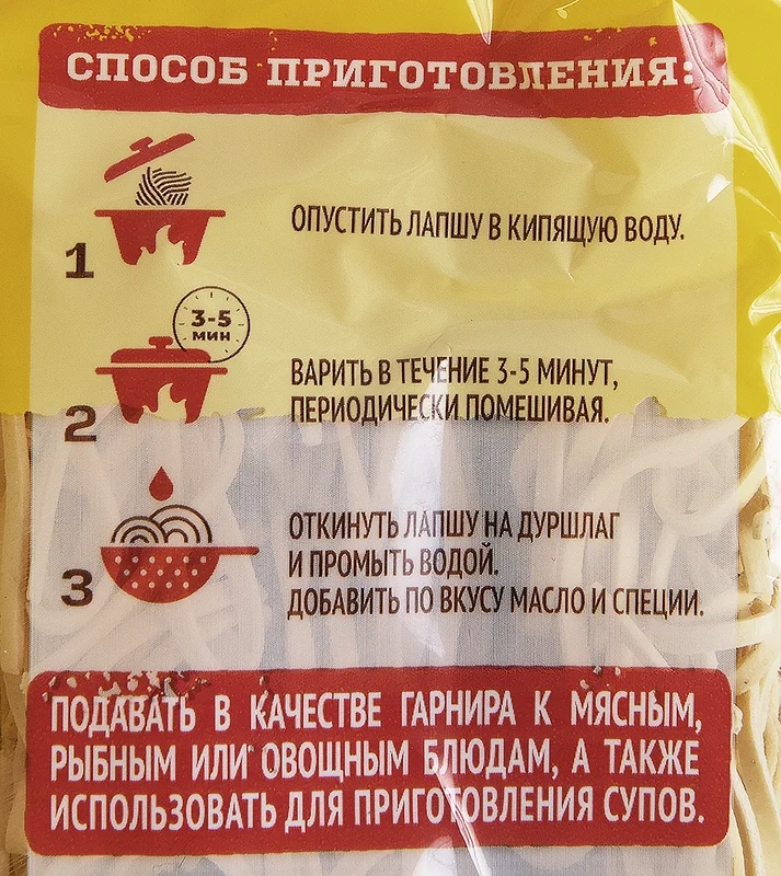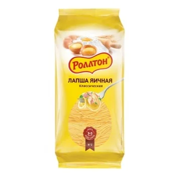 Лапша Роллтон яичная классическая — универсальный продукт, который одинаково хорошо подходит для приготовления первых и вторых блюд. Ее можно добавлять в куриный и другие виду супов, а также использовать в качестве сытного гарнира к котлетам, запеченной рыбе, тушеным овощам или подавать с различными соусами: томатным, сырным, сливочным или грибным. Время варки макаронных изделий составляет всего 3–5 минут. Спагетти, произведенные из качественных ингредиентов, не слипаются и не теряют формы.