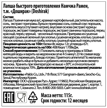 Рисовая лапша (рисовая мука, вода питьевая, стабилизатор (крахмал тапиоковый модифицированный), соль), соус Фо Бо (вода питьевая, соль, сахар, овощи (лук, овощная смесь молотая (тапиока, кукуруза, картофель, батат)), усилители вкуса и аромата (Е621, Е635), жир говяжий, ароматизаторы, пряности (имбирь, перец черный, кориандр, корица, кардамон, анис), мальтодекстрин, стабилизатор (крахмал тапиоковый модифицированный), регулятор кислотности (сукцинат натрия), красители (сахарный колер IV, куркумин), консервант (бензоат натрия), подсластитель (аспартам)); смесь с сушеными овощами (лук зеленый, морковь, кориандр, пшеничный текстурат (мука пшеничная, пшеничный белок, регулятор кислотности (Е450 (iii)), стабилизатор (карбонат натрия), краситель (сахарный колер III), антиокислитель (Е306)).