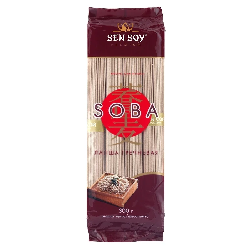 Любители азиатской кухни по достоинству оценят японскую лапшу Soba Сэн Сой, изготовленную из гречневой муки. С помощью этого традиционного японского продукта получаются удивительно вкусные гарниры, азиатские супы и салаты. Лапша имеет характерный коричневатый цвет и нежный мягкий вкус. Станет полезной альтернативой обычной вермишели – в ней содержатся полезные минералы и витамины: кальций, йод, фосфор, железо, магний и витамин В. Для удобства приготовления лапша Сэн Сой разделена на 4 порции, связанных бумажными ободками.