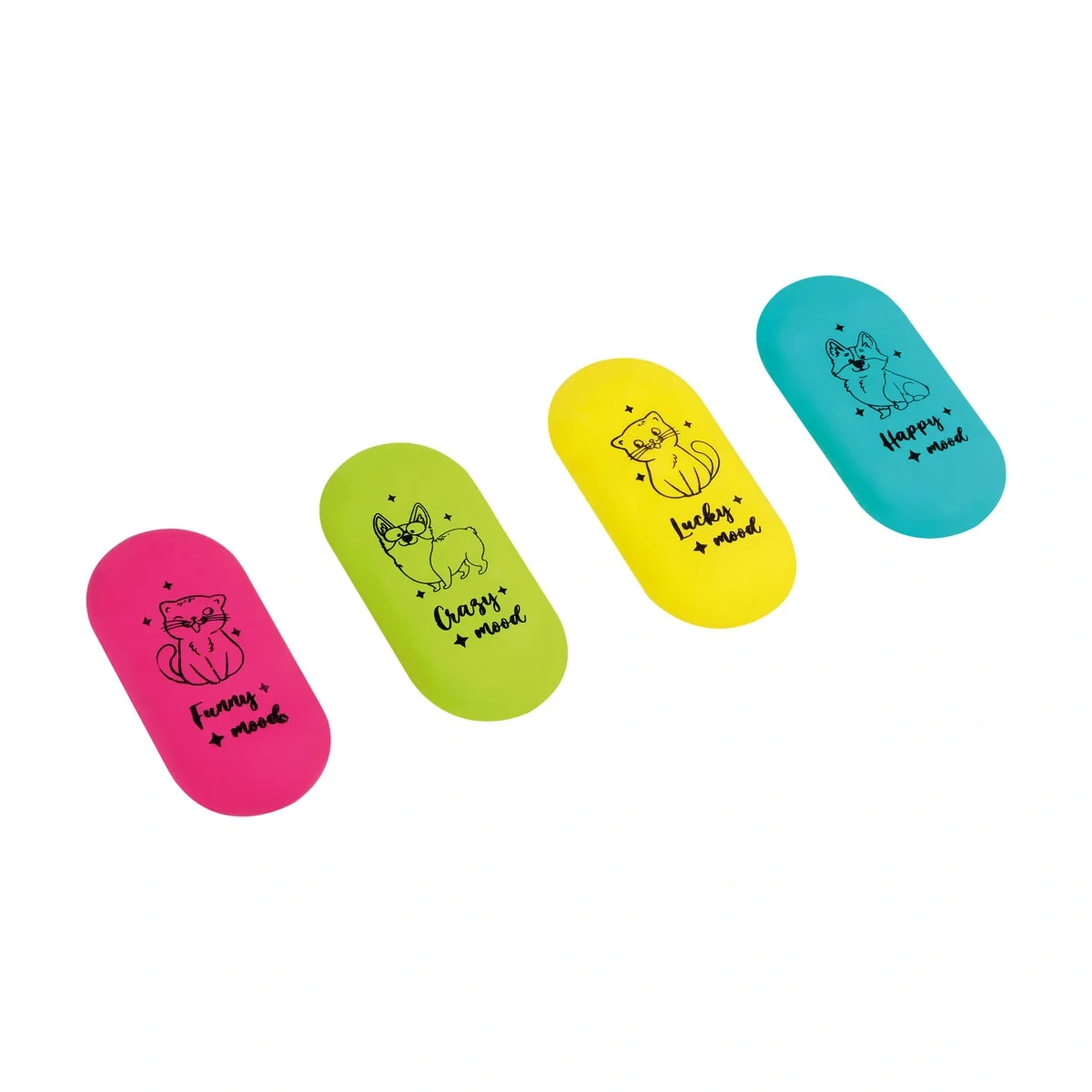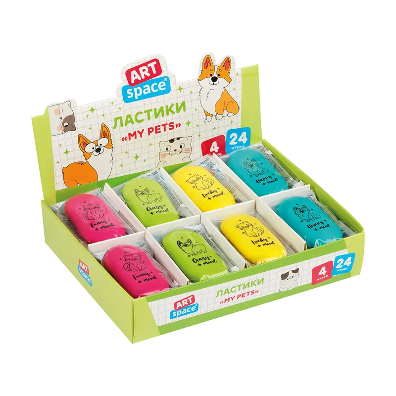 Ластик ArtSpace My Pets – яркий и забавный помощник в школе, офисе и дома. Ластики овальной формы выполнены из термопластичной резины. Представлено 4 милых дизайна ластика. Размер – 60*28*12 мм. Отлично стирает чернографитный карандаш. Ластики представлены в красочном дисплей-боксе.