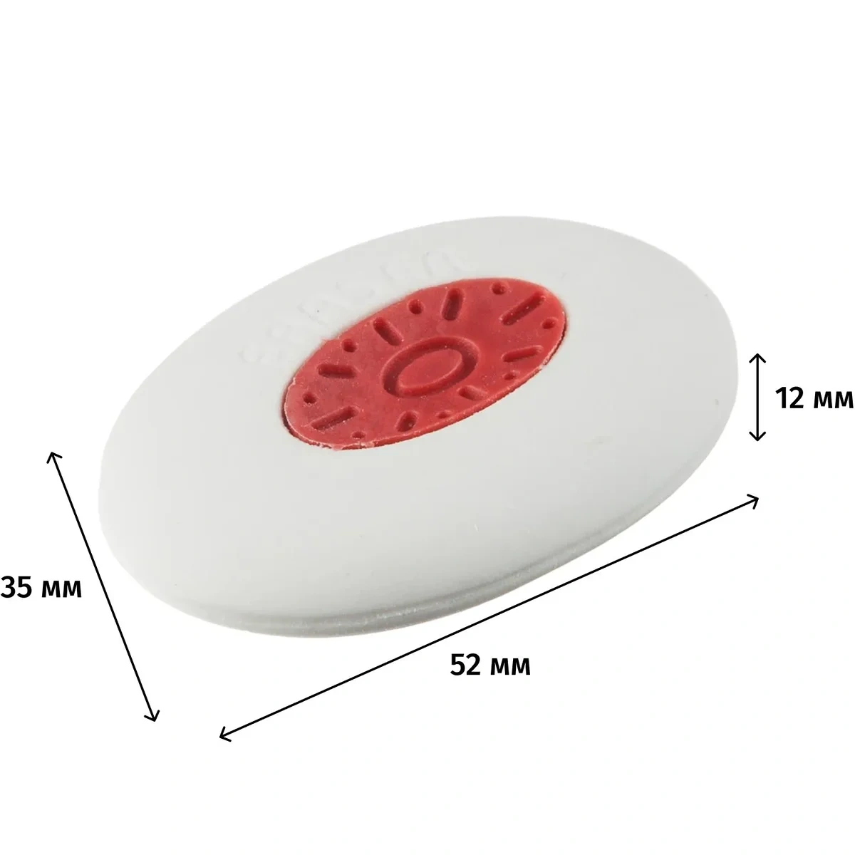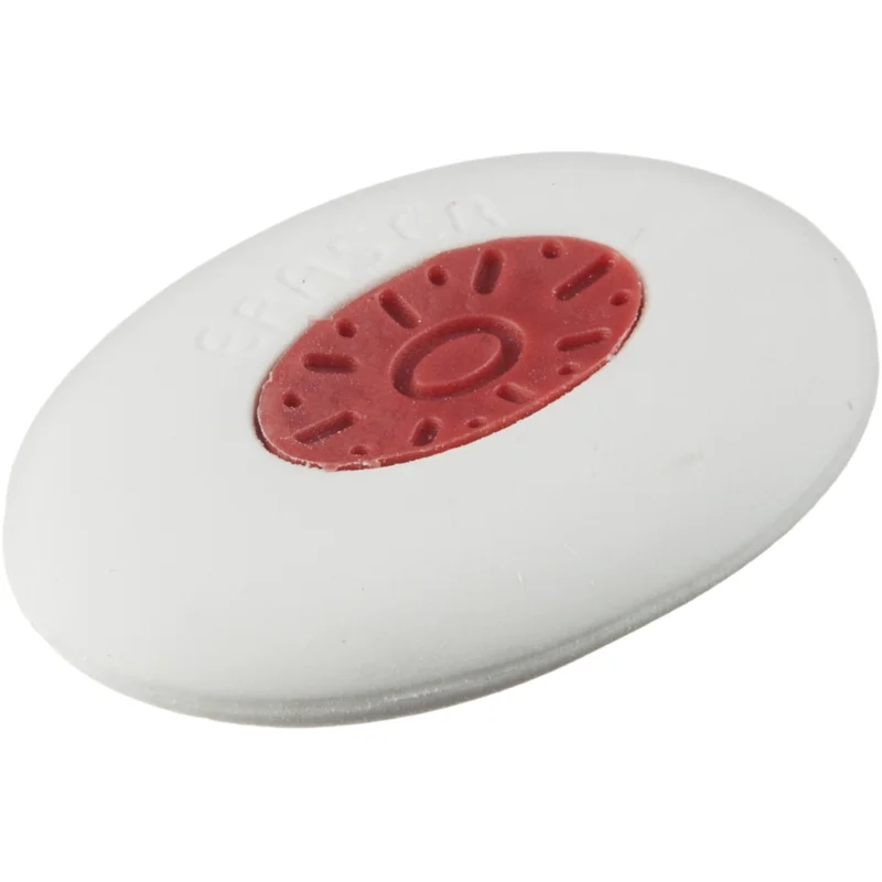 Овальный ластик с красным пластиковым держателем, цвет ластика — белый. Сделан из синтетической резины со свойствами, идентичными натуральному каучуку. Приятен на ощупь, и благодаря своей эргономичной форме, комфортно располагается в руке. Подходит для стирания графитовых рисунков и надписей. Не оставляет разводов и не нарушает фактуру поверхности. Изготовлен по технологииDust-free . Поставляется в защитной упаковке с европодвесом. Размер 52×35×12 мм. В упаковке 2 штуки.