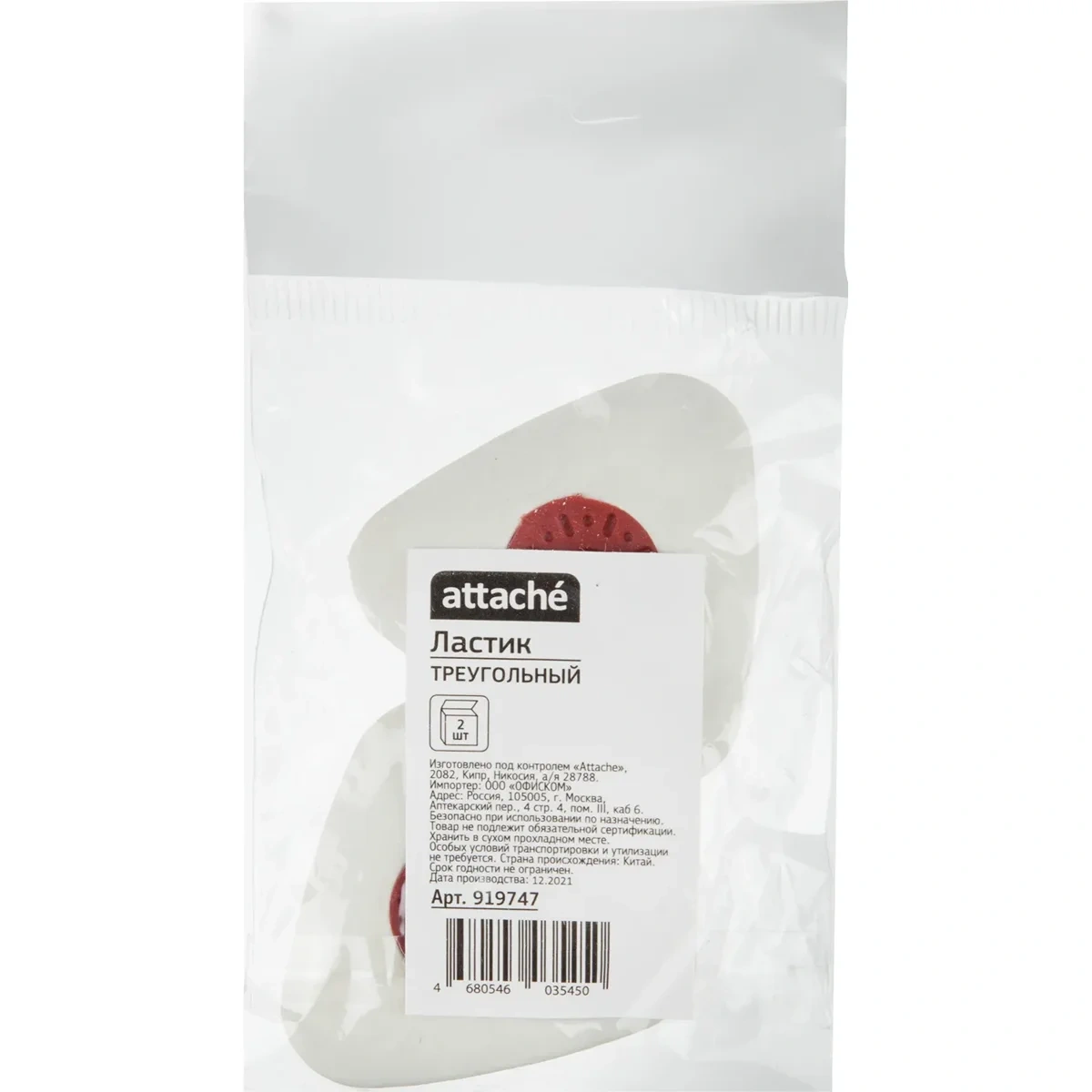 Ластик Attache треугольной формы, белого цвета, с красным пластиковым держателем изготовлен из термопластичного каучука. Приятен на ощупь и благодаря своей эргономичной форме, комфортно располагается в руке. Подходит для стирания графитовых рисунков и надписей. Не оставляет разводов и не нарушает фактуру поверхности. Изготовлен по технологии Dust-free. Поставляется в упаковкепо 2 шт. Размер 41?39?12 мм.