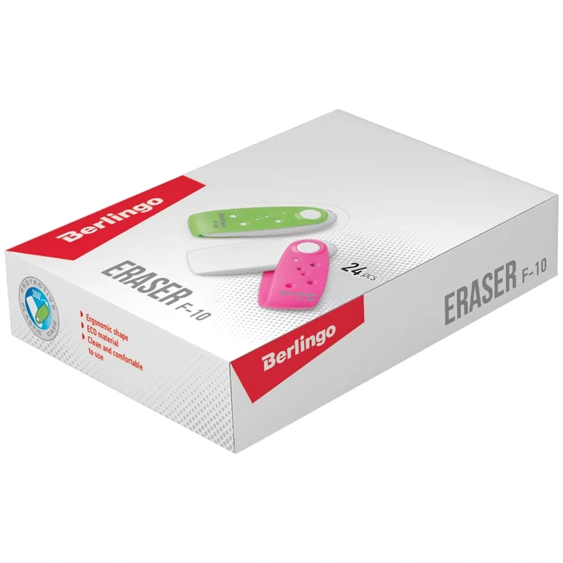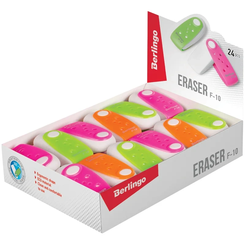 Ластик 'F-10' выполнен из высококачественной термопластичной резины. Каждый ластик имеет штрихкод. Упаковка в дисплей. 3 цвета ассорти
