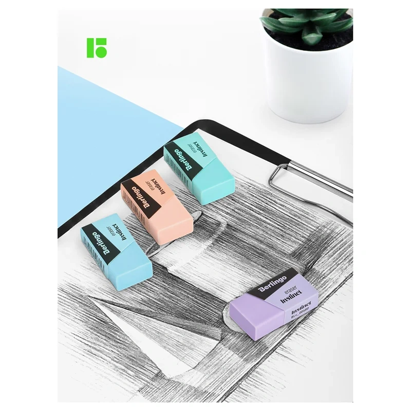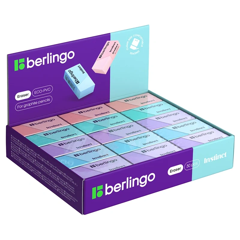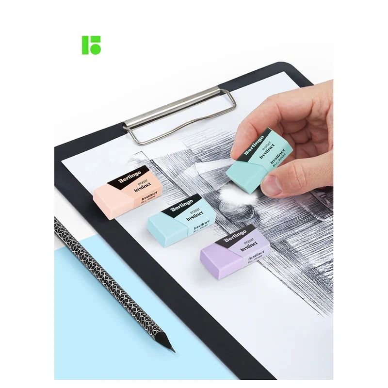 Ластик выполнен в стиле коллеции Berlingo 'Instinct'. Пастельные цвета в сочетании с черным: розовый, лаванда, мятный, аквамарин. Ластики выполнены из Eco-Pvc. Не токсичны, не содержат вредных компонентов и фталатов. Прекрасно справляются с линиями от чернографитного карандаша,