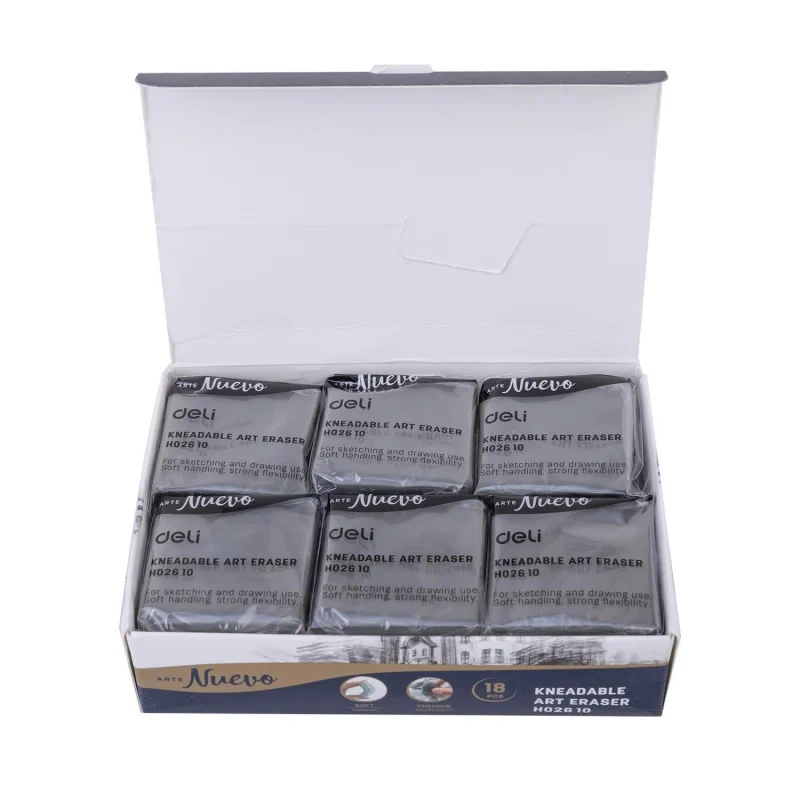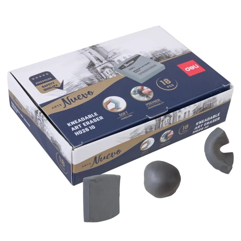 Ластик клячка предназначен для осветления угольных, пастельных штрихов, для удаления загрязнений с бумаги, а также коррекции светотени. Оптимальный размер 42×42×12 мм и отличное качество исполнения делают ластик Deli замечательным и незаменимым инструментом для художников. В упаковке 18 шт.