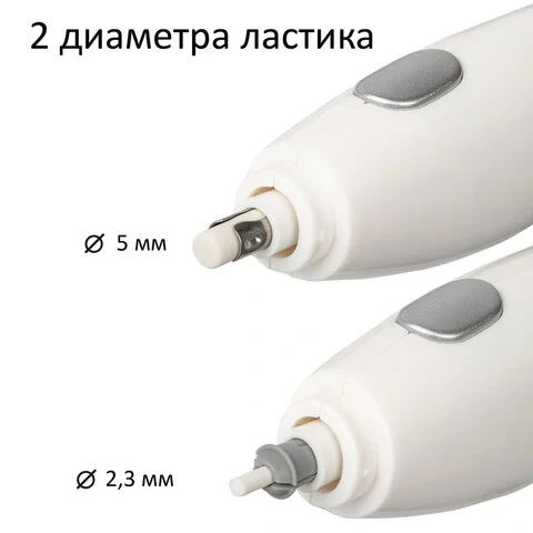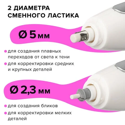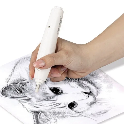 Работает от встроенного аккумулятора, USB-провод для зарядки входит в комплект. При помощи мощного внутреннего мотора насадка-ластик приходит в движение и позволяет очень точно корректировать эскиз или чертеж, создавать блики на карандашных рисунках. В комплект входят 8 дополнительных ластиков-насадок размером 5х25 мм, 8 ластиков-насадок размером 2,3х25 мм и два пластиковых держателя для них.
