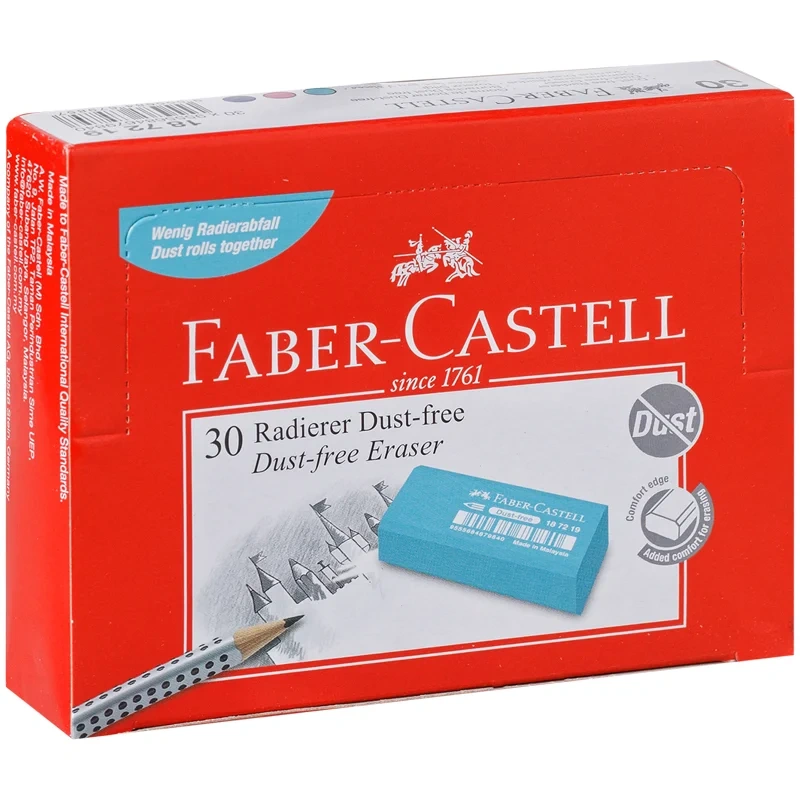 Ластик Dust Free от легендарного немецкого производителя Faber-Castell размером 11*18*41 мм имеет прямоугольную форму. Не содержит вредных для здоровья пластификаторов из фталатов. Прекрасно подходит для удаления надписей с бумажных поверхностей, сделанных чернографитовым карандашом. Благодаря технологии Dust Free ластик оставляет минимальное количество мусора во время стирания.