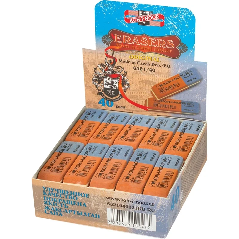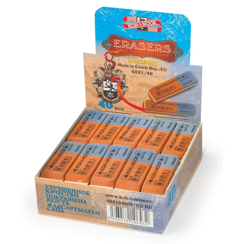 Двухсторонний ластик скошенной формы изготовлен из натурального каучук без добавления пластика и фталатов. Красная часть более мягкая, подходит для стирания линий от карандашей средней твердости (3B — 3H). Синяя — более жесткая, предназначена для стирания чернил. Поставляется в картонном дисплее размером 115×102×35 мм