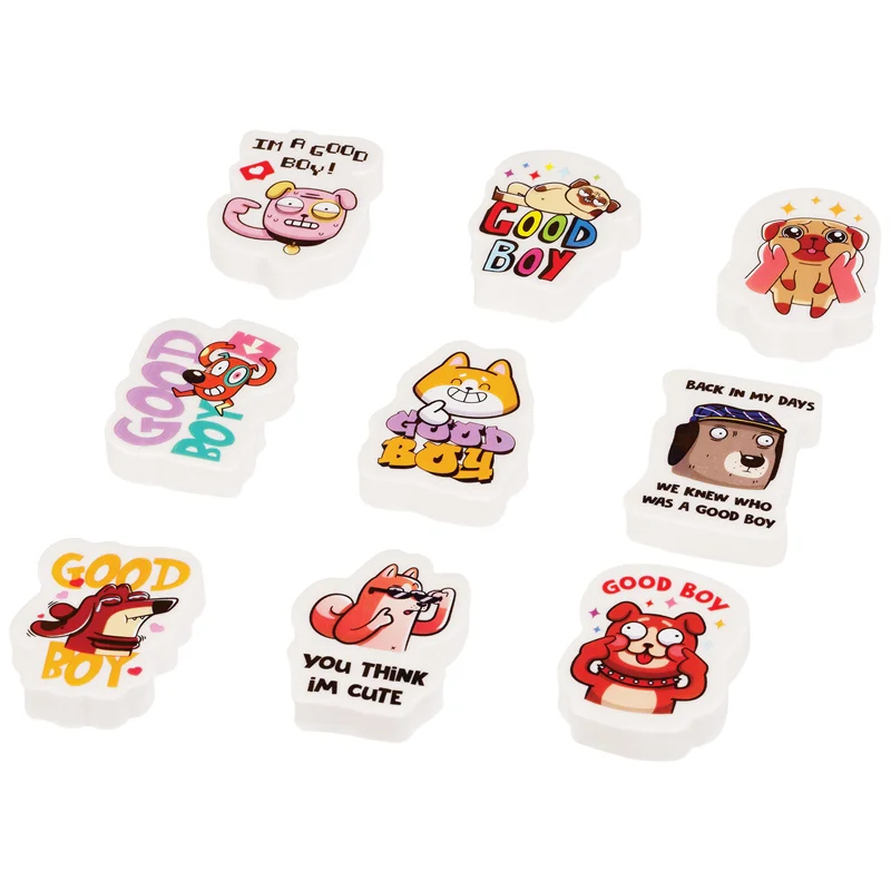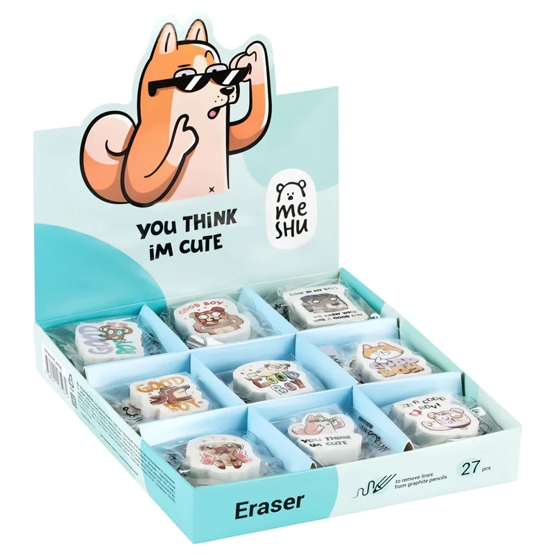 Ластик MESHU Good boy – яркий и забавный помощник в школе, офисе и дома. Ластики фигурной формы выполнены из высококачественной термопластичной резины. Представлено ассорти из 9 веселых дизайнов ластика белого цвета с рисунком забавных песиков. Размер – 40*30*13 мм. Отлично стирает чернографитный карандаш. Ластики представлены в дисплей-боксе, каждый упакован в отдельный пакет.