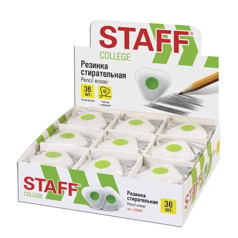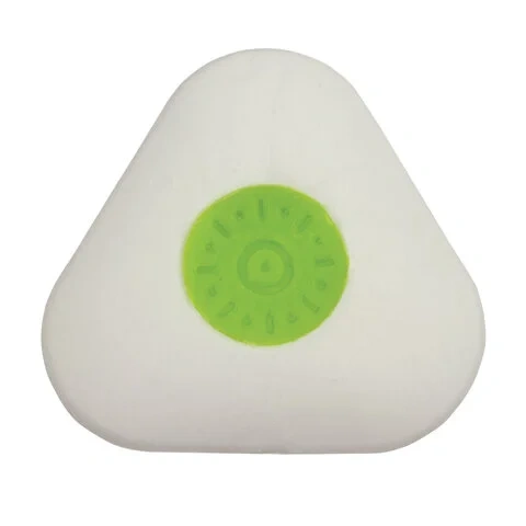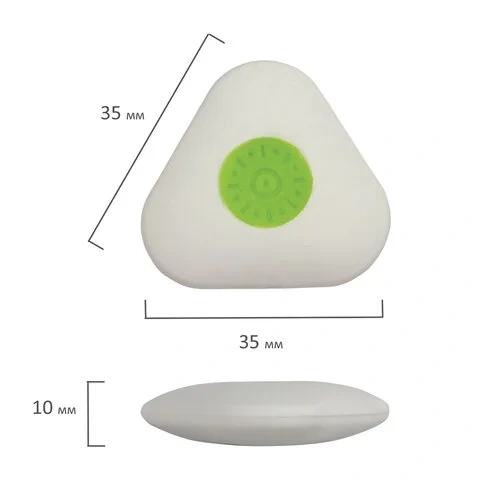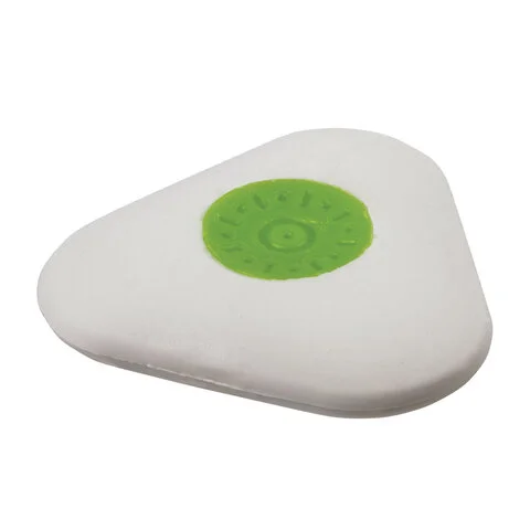 Предназначен для удаления надписей и рисунков, сделанных чернографитными карандашами. Имеет треугольную форму. Пластиковый держатель салатового цвета не только служит отличным дополнением к белому ластику, но и обеспечивает комфорт при письме. Размер - 35х35х10 мм. Ластики упакованы в дисплей.