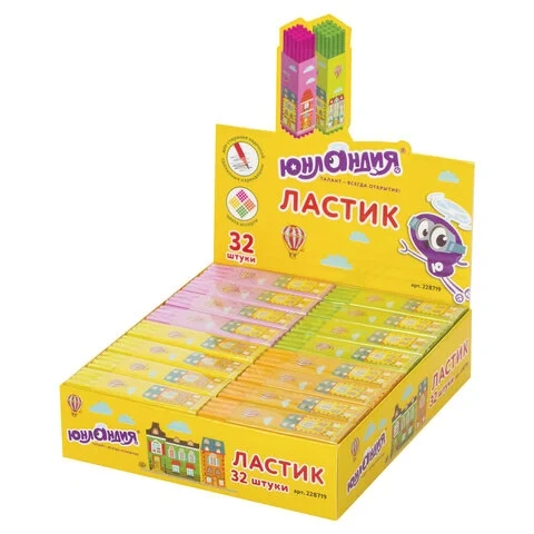 Имеет прямоугольную форму, поставляется в четырех цветах ассорти. Ластик обеспечит лёгкое и чистое стирание без повреждения поверхности бумаги и без образования бумажной пыли. Размер - 64х15х15 мм. Поставляется в картонном дисплее. Единица товара имеет картонный держатель.