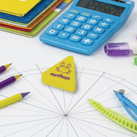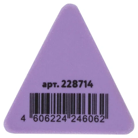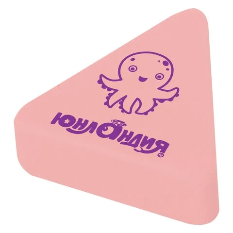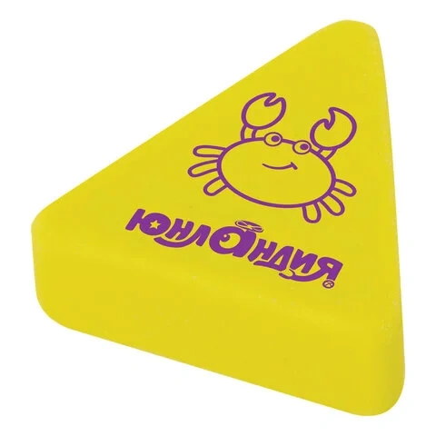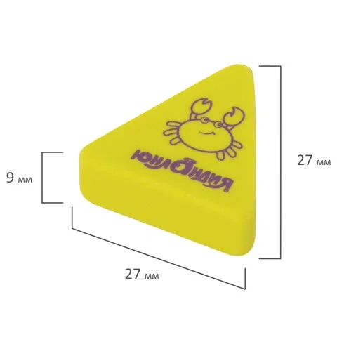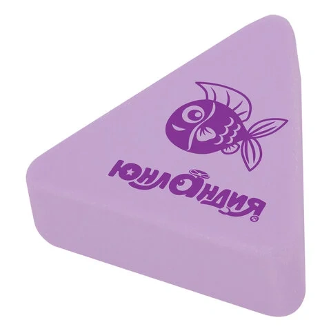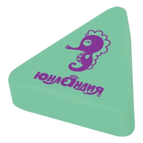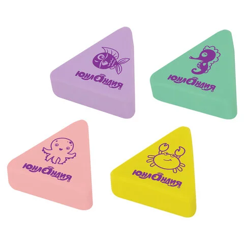Имеет треугольную форму в поставляется в четырех цветах ассорти с рисунками морских обитателей. Ластик обеспечит лёгкое и чистое стирание без повреждения поверхности бумаги и без образования бумажной пыли. Размер - 27х27х9 мм. Поставляется в картонном дисплее.
