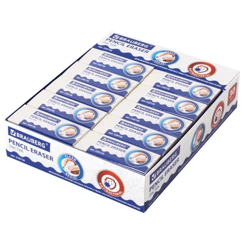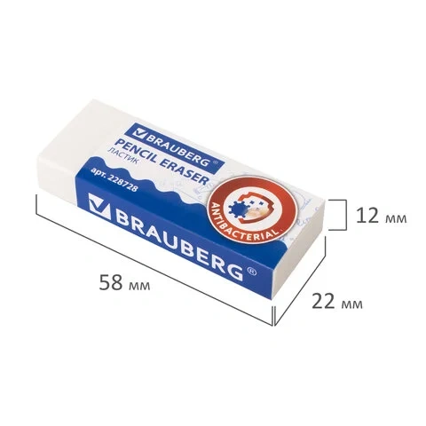 Ластик BRAUBERG 'АНТИБАКТЕРИАЛЬНЫЙ', 58х22х12 мм, белый, прямоугольный, картонный держатель, 228728