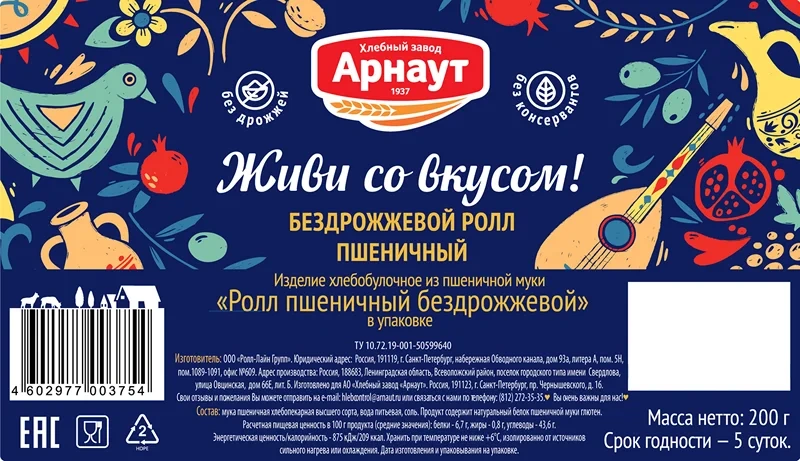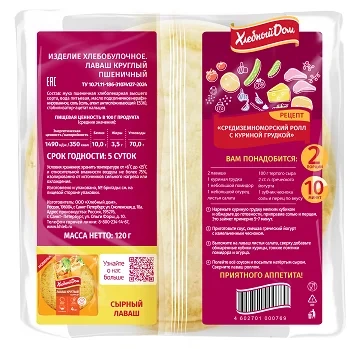 Изделие хлебобулочное из муки высшего сорта. Представляет собой пресный белый хлеб в виде тонкого полотна со слегка пузырчатой поверхностью золотистого цвета, аккуратно сложенный в несколько слоев и упакованный в бумажный пакет с прозрачным окном.