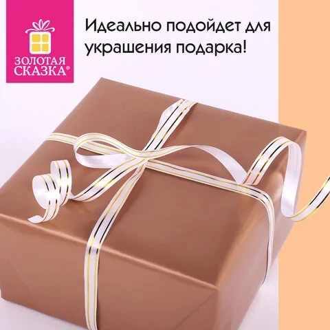 Лента упаковочная декоративная для подарков, золотые полосы, 12 мм х 45 м, белая, ЗОЛОТАЯ СКАЗКА, 59
