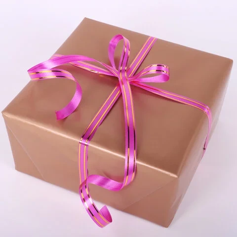 Лента шириной 12 мм и длиной 45 м изготовлена из прочного полипропилена (70%) и полиэтилена (15%) и полиэтилентерефталата (15%). Толщина ленты 120 мкм (0,12 мм). Цвет ленты - розовый с золотистыми полосами. Лента намотана на картонную бабину и упакована в термоусадочную пленку, поверх которой есть стикер с краткой информацией о товаре.