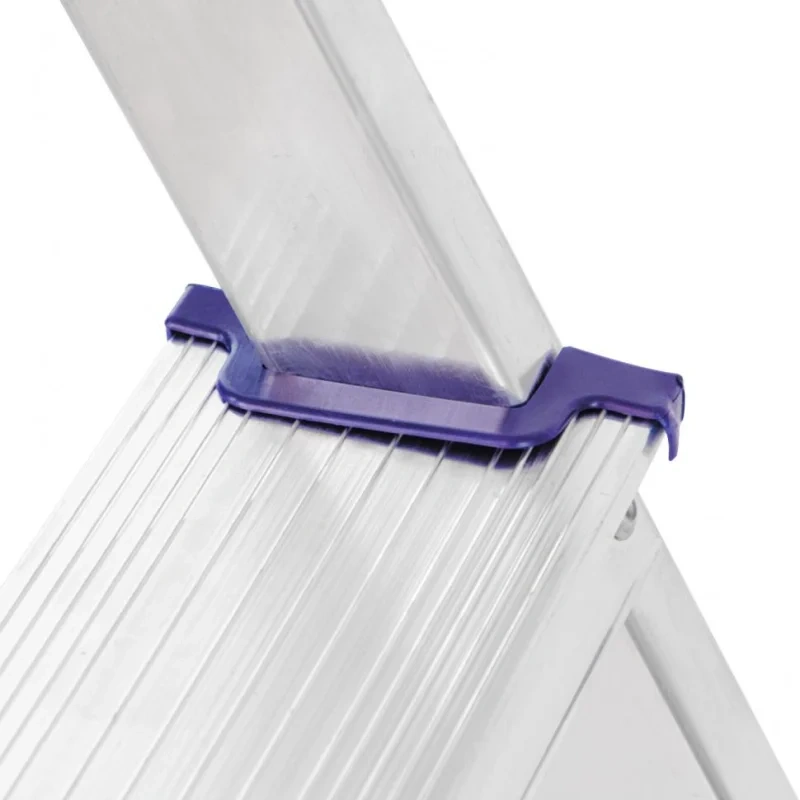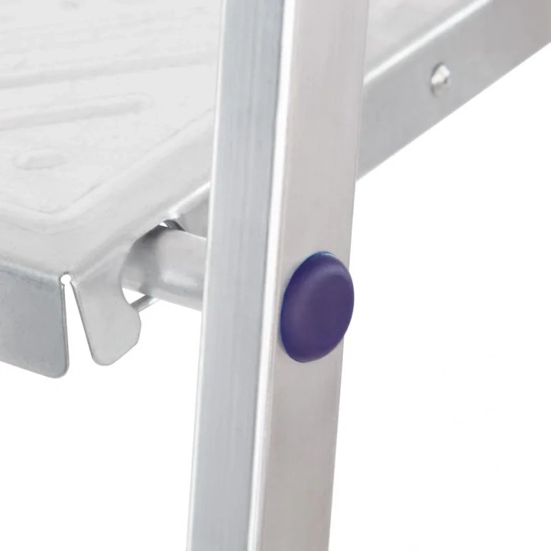 — Рифлёная поверхность ступеней шириной 80 мм исключает соскальзывание стопы. Сверху стремянки есть дуга безопасности для защиты от падения.