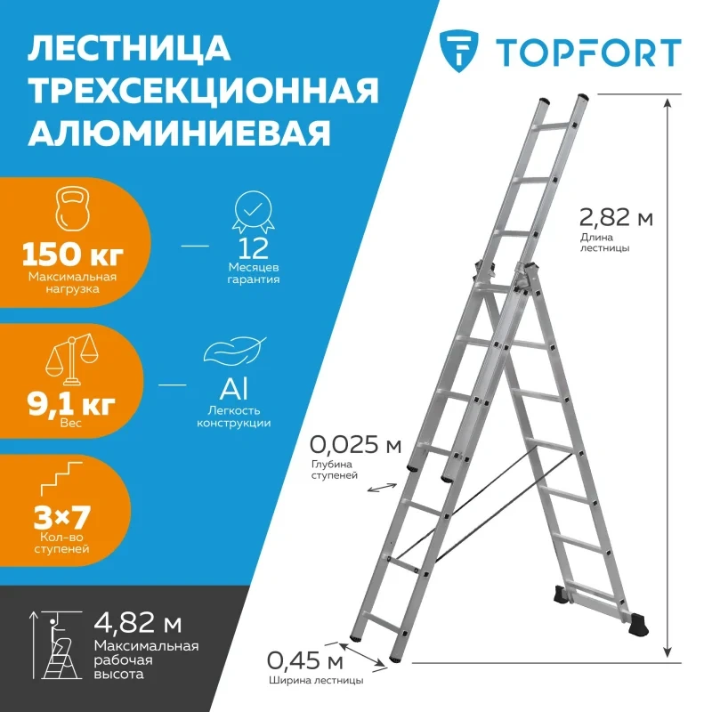 Лестница трехсекционная алюминиевая 3х9 ступеней TOPFORT
