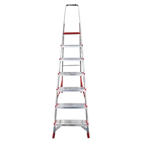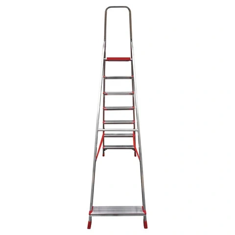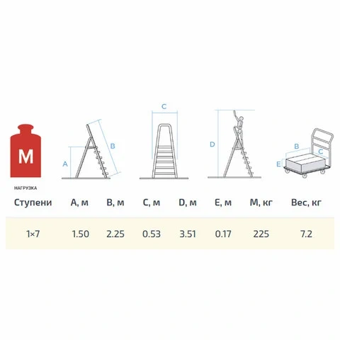 Рифлёная поверхность ступеней способствует безопасному подъёму и спуску, а прочное крепление ступеней к боковинам 6 заклёпками придаёт конструкции высокую устойчивость. Опорные наконечники из прочного пластика обеспечивают устойчивое положение. Лестница располагает дугой безопасности 600 мм и прочными страховочными ремнями.