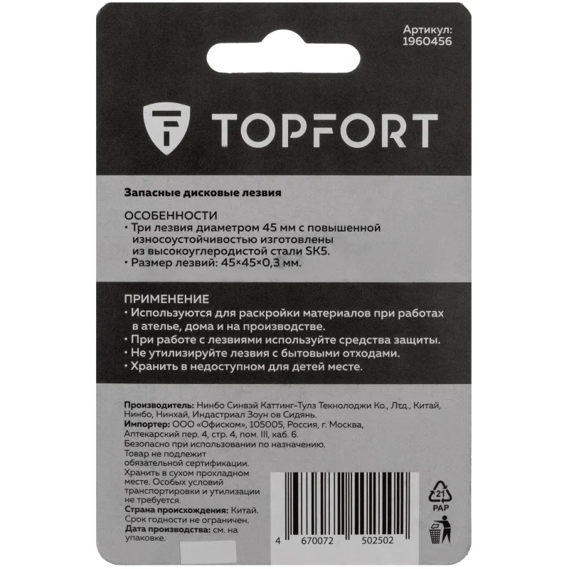 Лезвие сменное для раскройного ножа Topfort SX45TY-1 стальное 45 мм дисковое (3 штуки в упаковке)