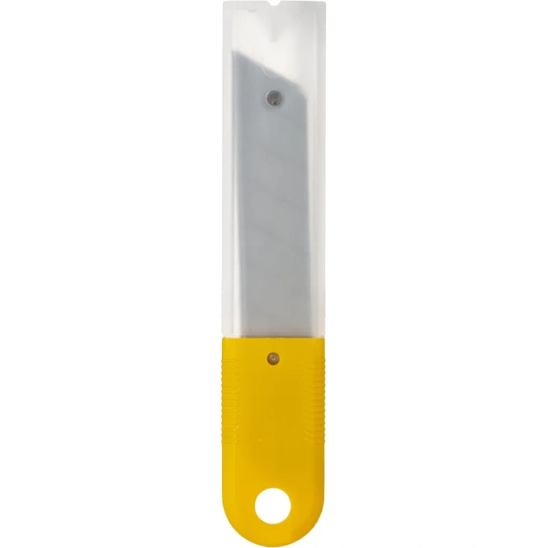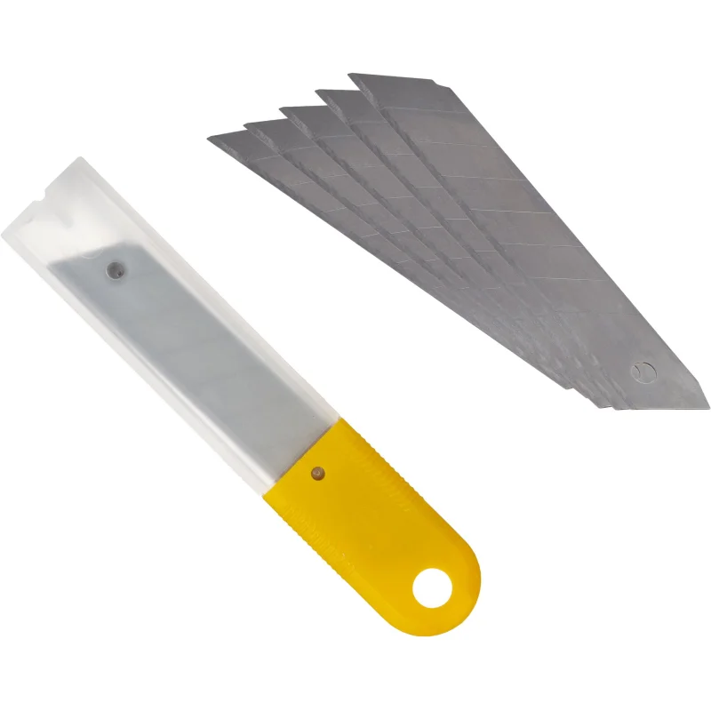 Конструкция сегментированная — 8 рабочих сегментов позволяют легко обновлять режущую кромку, не требуя заточки. Ширина лезвия составляет 18 мм, толщина — 0.5 мм, длина — 100 мм. В комплект входит 10 лезвий, помещённых в пластиковый контейнер для безопасного хранения и транспортировки.