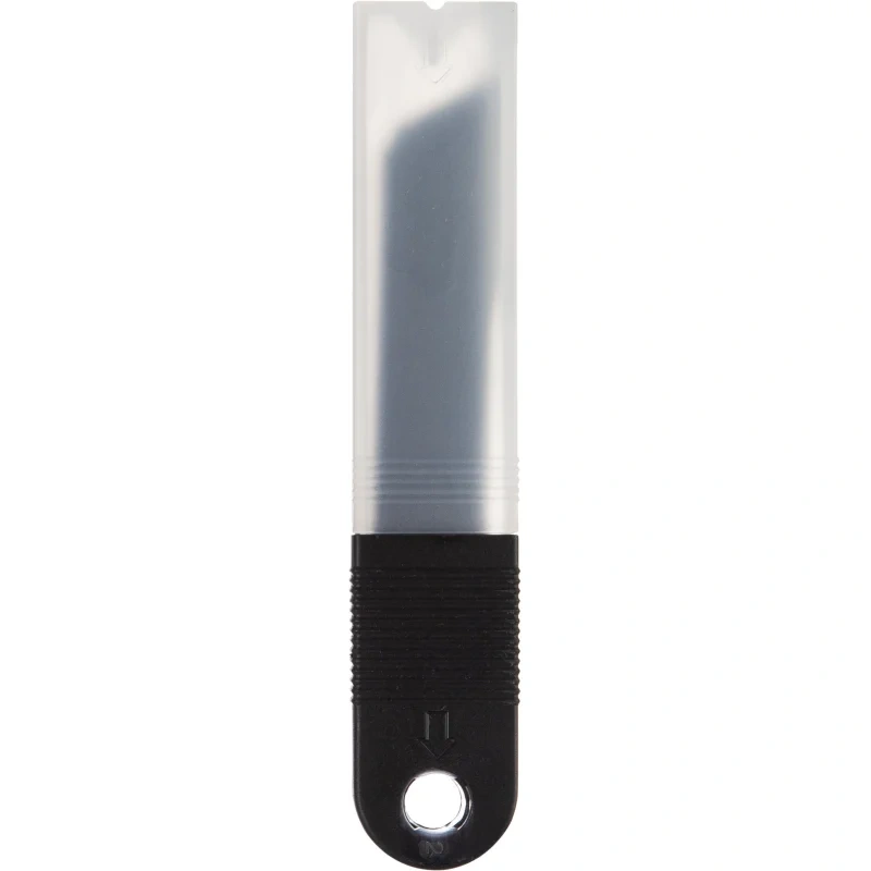 Конструкция сегментированная — 8 рабочих сегментов позволяют обновлять режущую кромку по мере износа. Ширина лезвия составляет 18 мм, толщина — 0.5 мм, длина — 100 мм. В комплект входит 5 лезвий, упакованных в пластиковый контейнер для безопасного хранения и транспортировки.