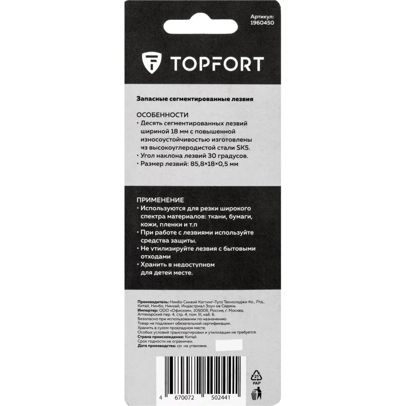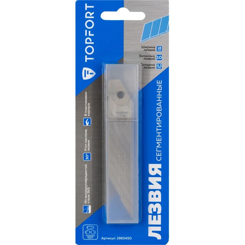 Лезвие сменное сегментированное Topfort SX40T-10 стальное 18 мм прямоугольное (10 штук в упаковке)