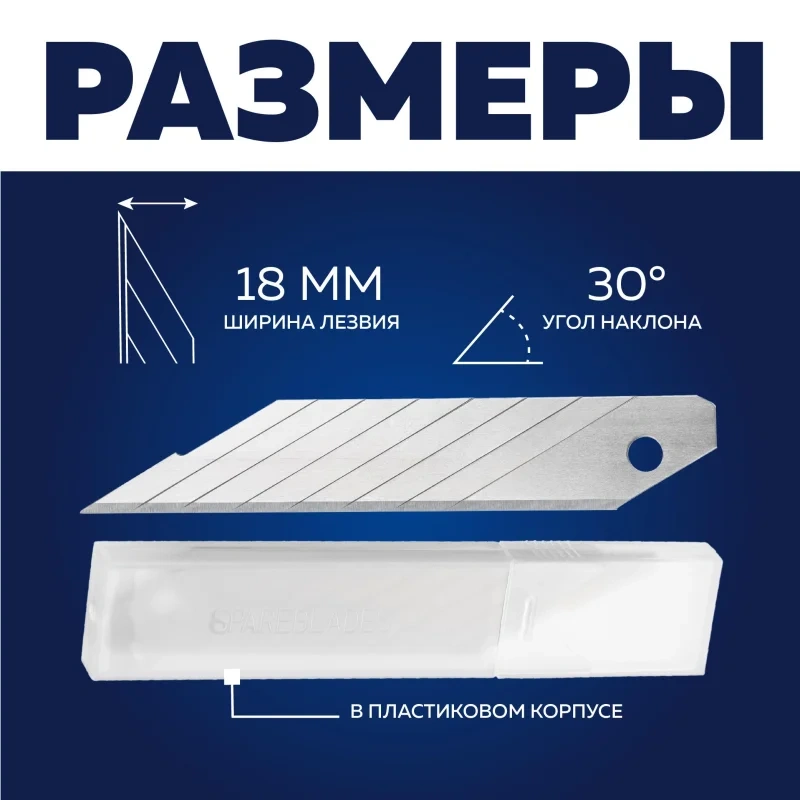 Сегментированная конструкция с 8 сегментами и углом наклона 30° позволяет легко обновлять режущую кромку по мере затупления. Лезвия имеют прямоугольную форму, толщину 0.5 мм, ширину 18 мм и длину 86 мм. В комплект входит 10 лезвий, упакованных в пластиковый контейнер, удобный для безопасного хранения и транспортировки.