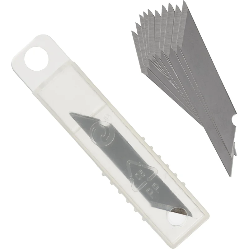 Лезвия изготовлены из прочной стали, устойчивой к износу и механическим нагрузкам. Несегментированная конструкция с углом наклона 9° обеспечивает высокую точность при вырезании мелких деталей. Ширина лезвия составляет 6 мм, толщина — 0.5 мм, длина — 40 мм.