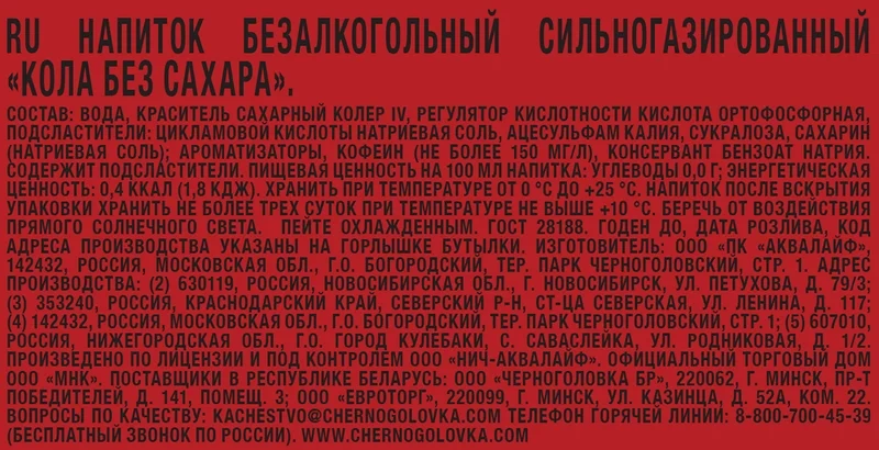 Напиток Черноголовка Кола без сахара газированный, 500мл x 12 шт