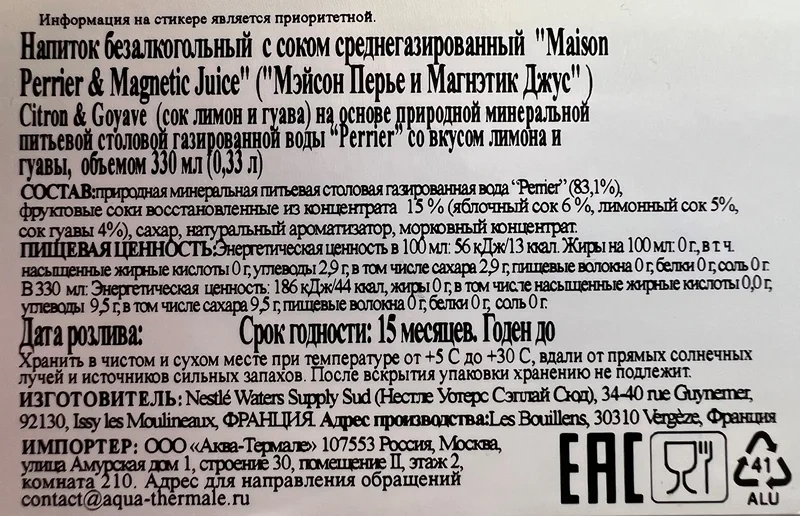 Напиток Maison Perrier Magnetic Juice Лимон и Гуава среднегазированный, 330мл