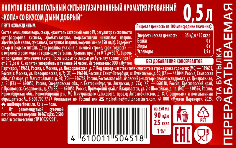 Напиток Добрый Кола дыня газированный, 1л x 12 шт