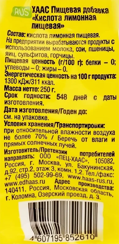 Лимонная кислота Haas пищевая, 250г
