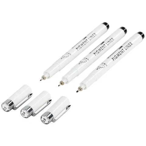 В наборе 3 черных капиллярных ручки с типом наконечника 'Линер': № 0.3, 0.4, 0.8. Номер ручки на кол...